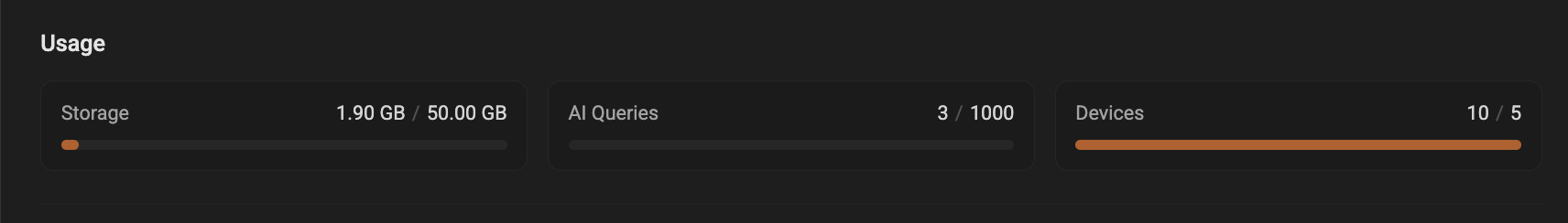 The Usage section shows three key consumption metrics: Storage, AI queries, and Devices. Each metric includes a numeric readout and a progress bar so you can quickly see how close you are to your plan limits.- Storage: shows the amount of data you are currently storing and your plan’s storage limit. The value is presented in human-friendly units (KB/MB/GB).